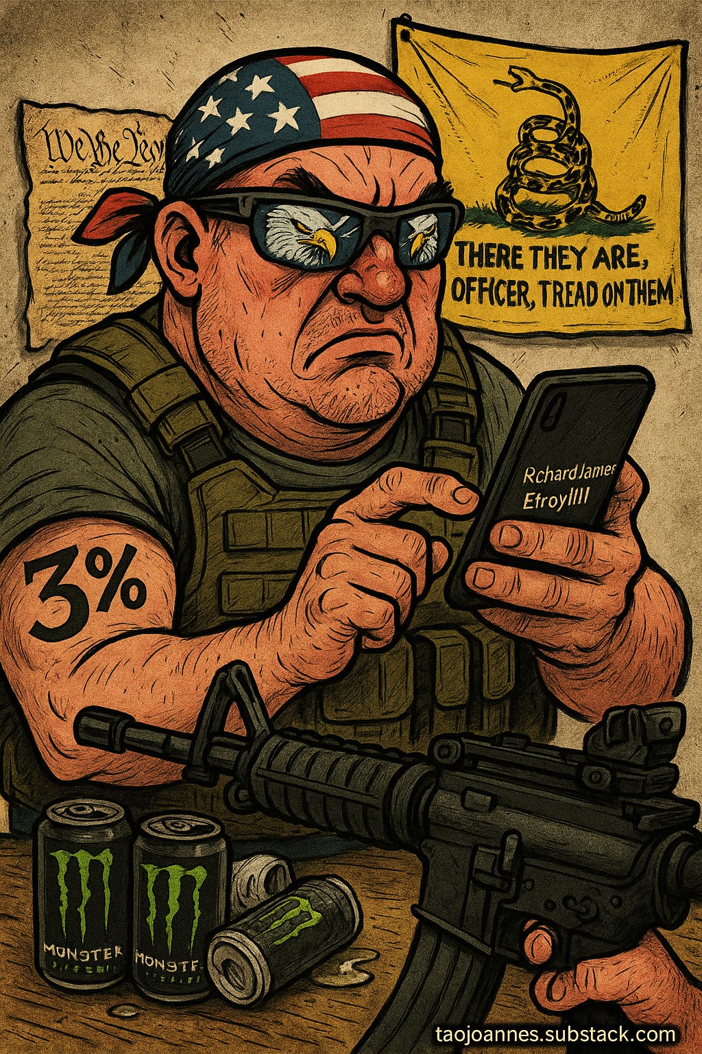 So forget your 3%. We’ve got a 6% now. And the difference isn’t just arithmetic. The Three Percenters built an identity around being the radical vanguard: the brave few willing to stand up while the masses cowered. But they’re no longer special. They're outnumbered. Outpaced. Outgunned — metaphorically, for now.