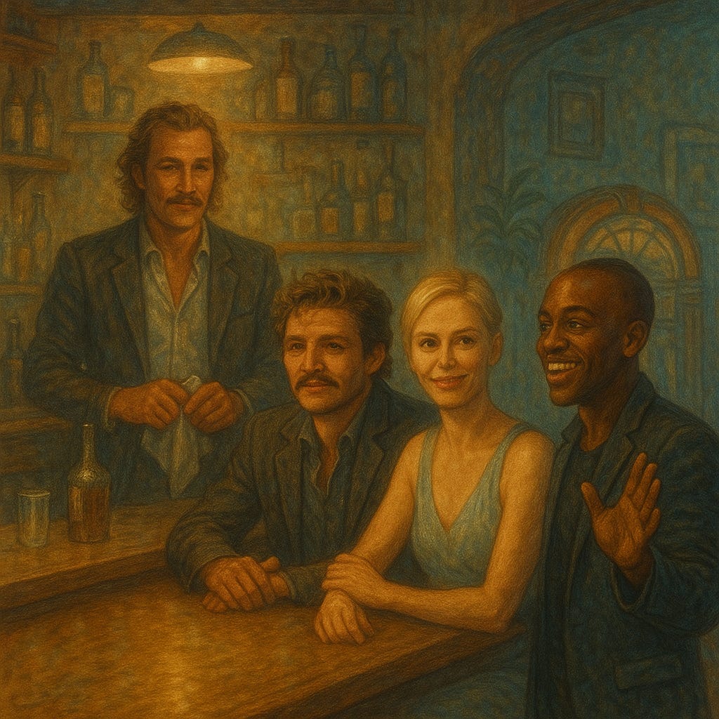 Not a bartender. The bartender. Shirt unbuttoned to the exact depth where mystery meets enlightenment. A belt buckle so heavy with symbolism it bends light. He doesn’t work here, the bar exists because he decided to stand behind it. When he leaves, it collapses back into the dream of a jukebox that wanted more.
